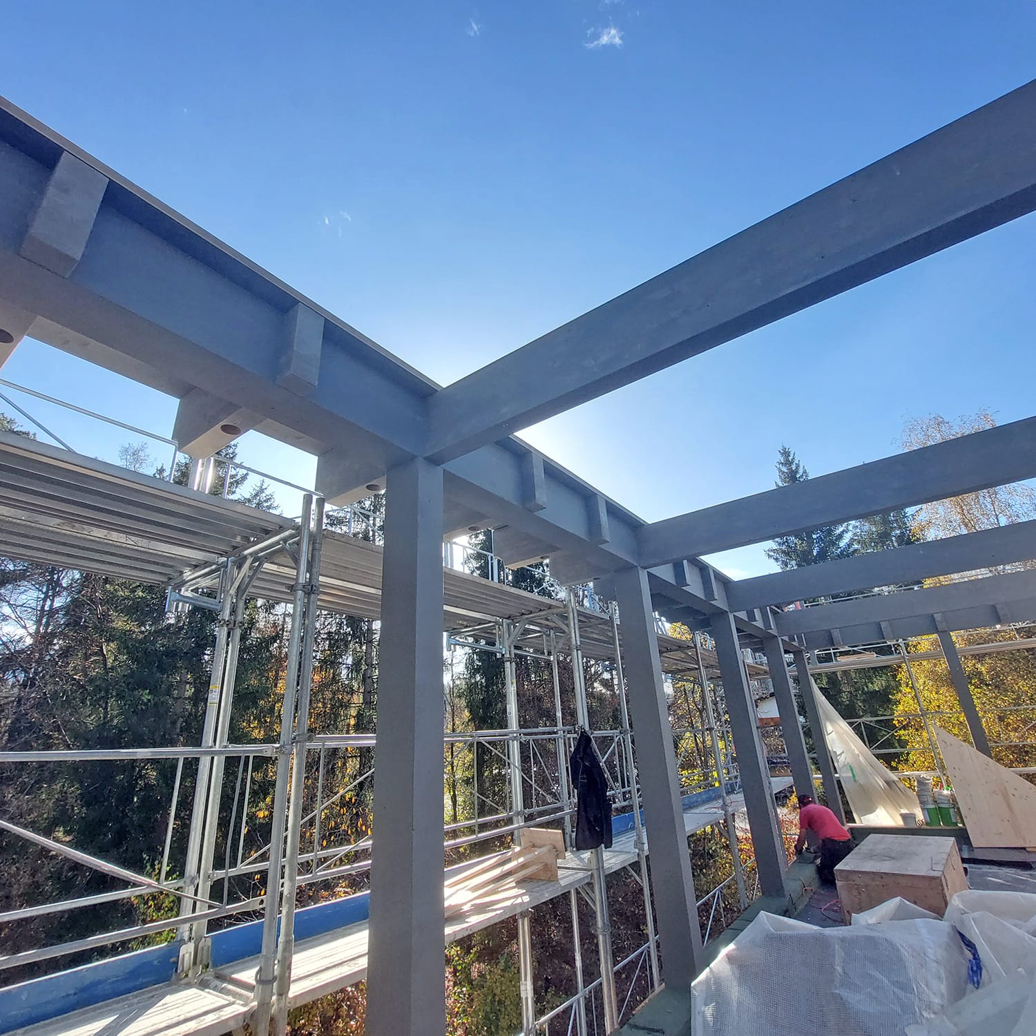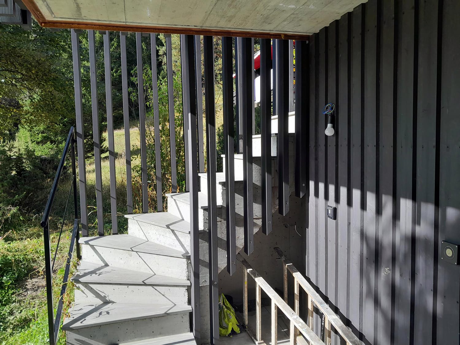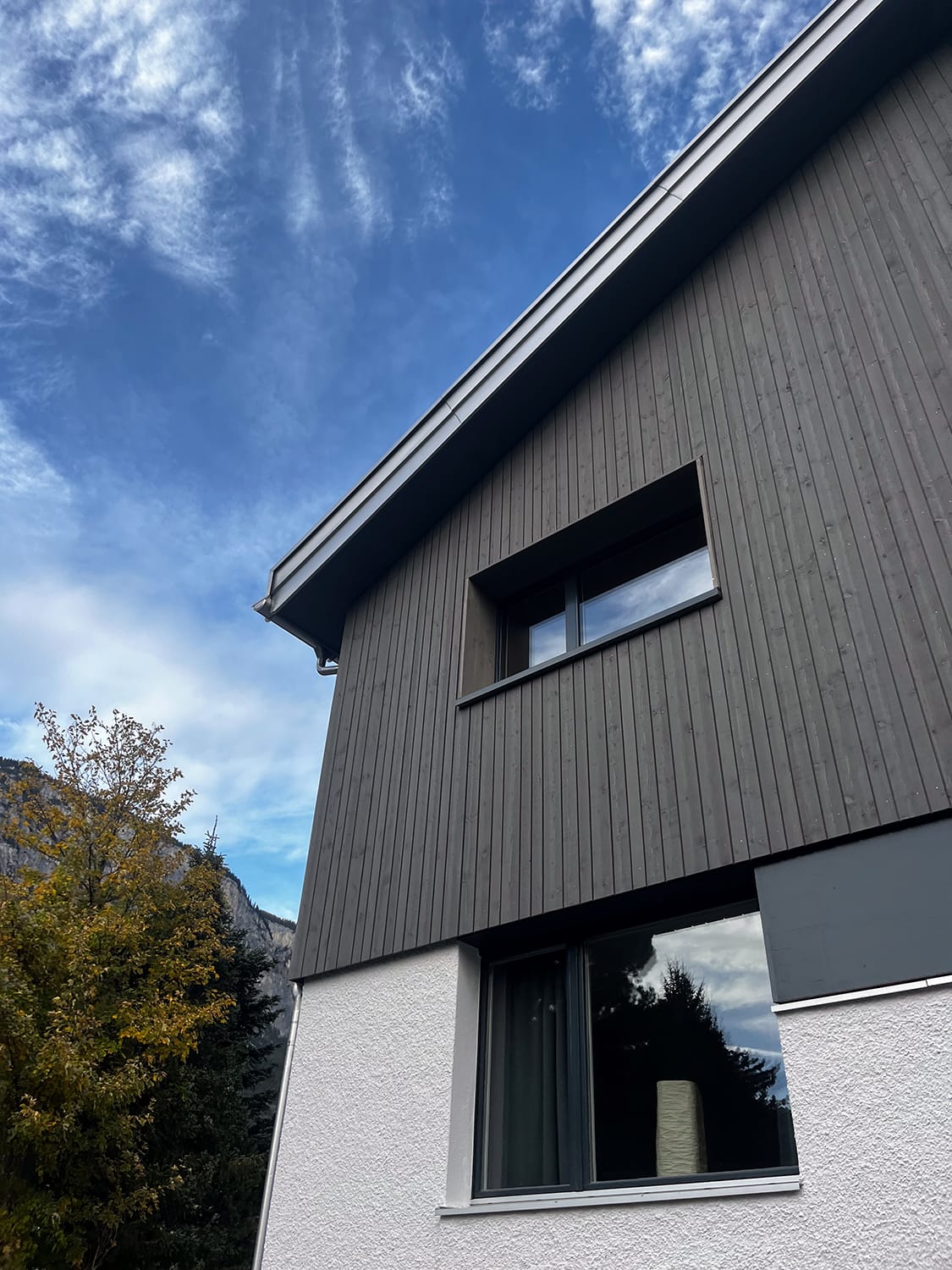 - Neubau Casa Mulania: Ausführung eines Daches in Holzelementbau inklusive Dachfensterfutter und Vordachplatten.